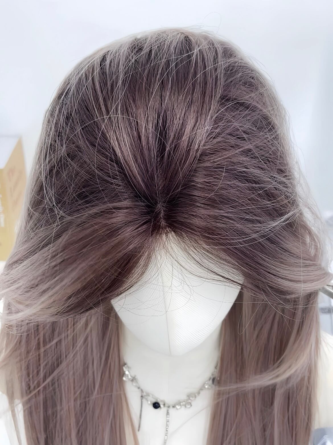 前髪の位置を確認しながら、前から後ろに向かってウィッグをかぶります。
